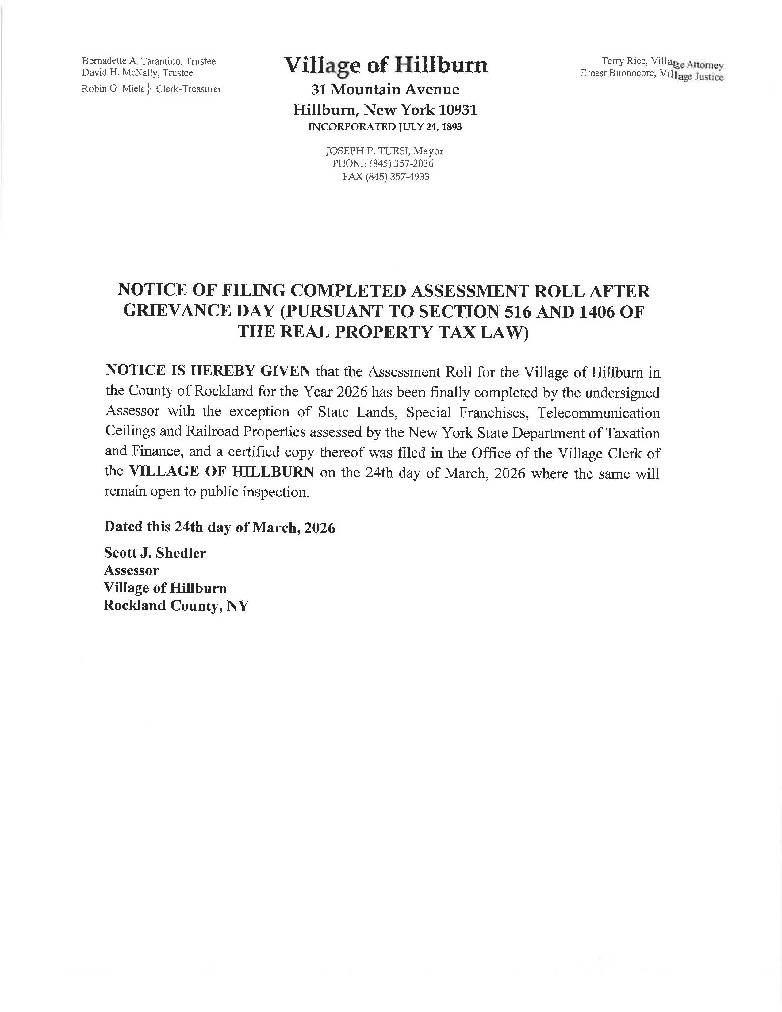 Admin Hillburn / Wednesday, March 25, 2026 / Categories: Uncategorized, Announcements/Notices Notice of Filing Completed Assessment Roll After Grievance Day Previous Article Rockland County Consumer Protection Print 0 Rate this article: No rating